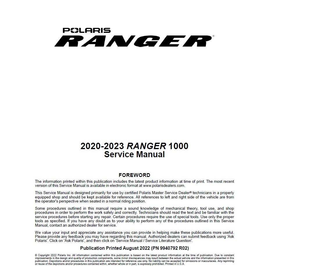 This is a DIGITAL DOWNLOAD of the 2020-2023 Polaris Ranger 1000 3 seater and crew service manual in PDF format.You will need Adobe Reader to view.All pages are printable.You can also transfer this file to a DVD if you would like to have a back up.